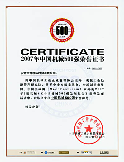 2007年《中國機械500強》暨《世界機械500強》發(fā)展報告會7月20在北京人民大會堂隆重舉行,我公司榮獲“中國機械500強”榮譽稱號,位列第370位。