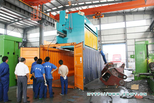 這套大型機床主機由兩臺250噸6米的數(shù)控板料折彎機組成,可實現(xiàn)單機及雙機聯(lián)動工作的功能,極大的方便了大型生產(chǎn)中的多元化要求。機器總重達50余噸,可完成12米的工件,對裝箱的操作技術(shù)要求很高,但由于我們機械化的車間及熟練的技術(shù)人員,裝箱過程雖然繁瑣但并不費力。由于整機超高超長,采用的是兩個開頂箱,將兩臺主機分開來裝。考慮到機器要在海上航行近一個月,裝箱的工作人員做足了防護措施:底部鋼條固定,兩側(cè)鐵絲固定,外加透明塑料膜,頂部自制框架固定并套上雨布等等,以免在運輸過程中造成對機器不必要的損壞。