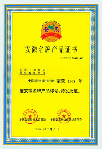 中德牌液壓板料折彎機(jī)喜獲2008年“安徽省名牌產(chǎn)品”的殊榮,這是繼2005年中德牌液壓擺式剪板機(jī)獲“安徽名牌產(chǎn)品”之后,中德機(jī)床的質(zhì)量和信譽(yù)又一次獲得認(rèn)可。與此同時(shí),中德牌液壓擺式剪板機(jī)也順利通過安徽名牌產(chǎn)品的復(fù)審,證書的有效期將延長至2013年。