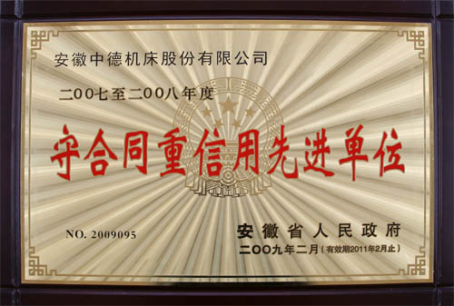 近日,我公司榮獲由安徽省人民政府頒發(fā)的二〇〇七至二〇〇八年度“守合同重信用先進(jìn)單位”榮譽(yù)稱號(證書號:2009095,有效期止2011年2月),也是我公司第二次獲得此項殊榮。